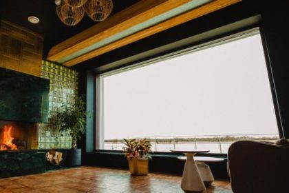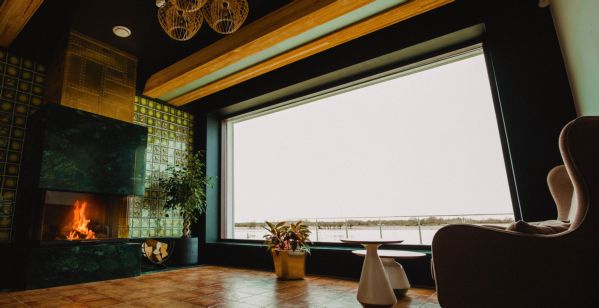 - КАМИННАЯ КОМНАТА — Панорамное окно на Волгу «в пол». Камин. Место для компании на 3-4 человек. Встречи закатов в холодное время. Курительные принадлежности, хьюмидор.